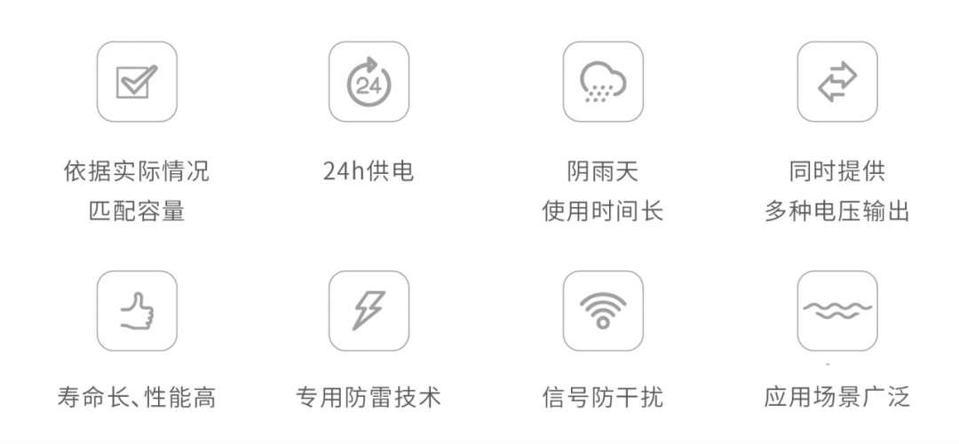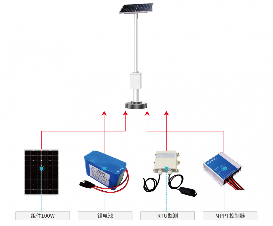 产品根据实际负载和阴雨天要求匹配100W-300W光伏组件、12V,30--200AH磷酸铁锂电池(或三元锂电池)(低温-30℃-50℃)。